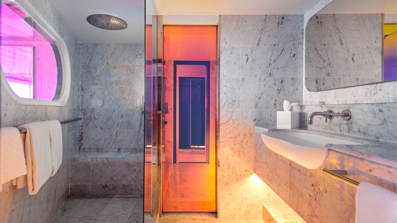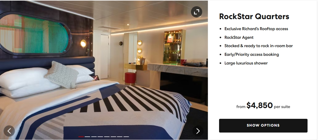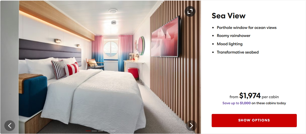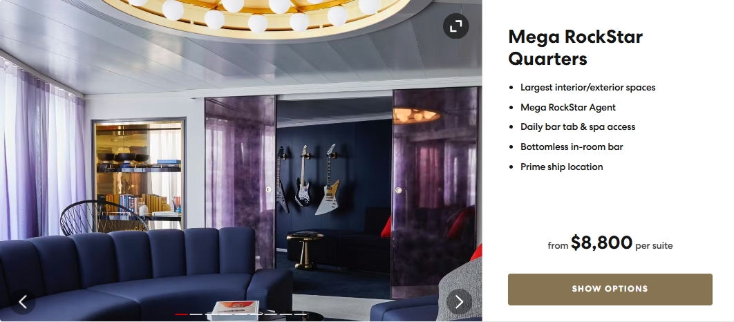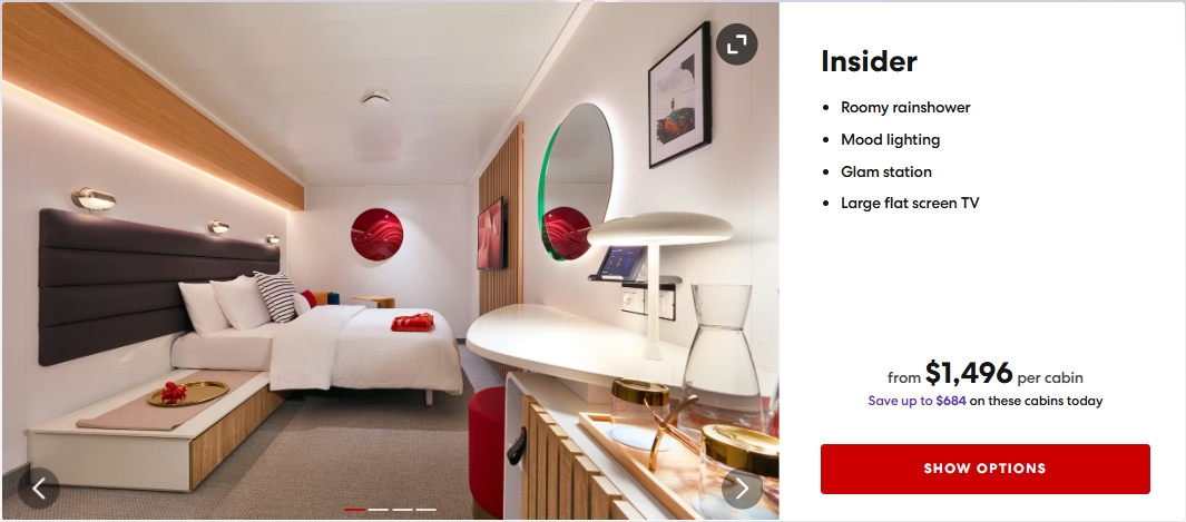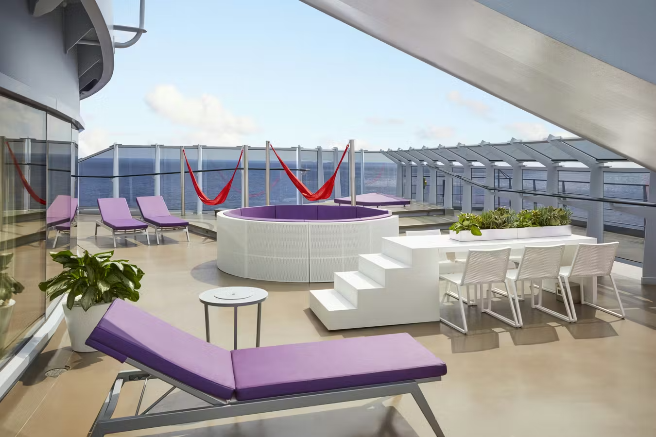 Virgin has the most stylish, modern, and sexy cabins and suites of any cruise line. Even their solo inside cabins are beautiful designed and decorated. There are inexpensive Insider rooms, Sea Terrace balcony rooms, ADA rooms, and stunning Rockstar and Mega Rockstar suites, some with their own massive balconies and even a private hot tub. The balcony rooms are amazing, but with so much to do on the ship, you may hardly be in your room and an inside cabin is also a great choice.