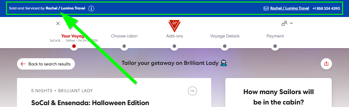 *Make sure it says “Sold and Serviced by Rachel / Lumina Travel” at the top of your window: