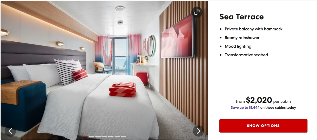 When booking with our group, you will receive a 10% discount on your cabin if you book a Central Sea Terrace, or regular The Sea Terrace cabin (other Seat Terrace cabins like Lock It In, XL, and Small Balcony do not count for the 10% discount). In order to be eligible for the 10% discount, you must book the room and pay your deposit at least 180 days before the sailing date (book the room before April 27, 2026).